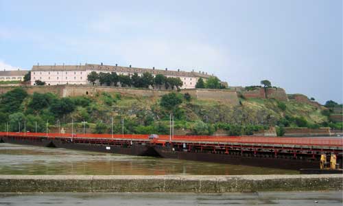 Brücke. Oben die Festung Petrovardin. Sie beherbergt